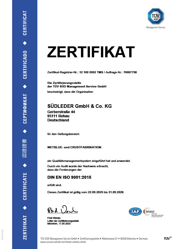Genauso leistungsstark sind wir in allen Qualitätsfragen. Das garantiert zum einen unsere Erfahrung mit dem Werkstoff Leder und zum anderen das zertifizierte Qualitätsmanagement nach DIN EN ISO 9001:2015. Es beinhaltet alle Arbeitsschritte: Von der sorgfältigen Kontrolle der angelieferten Kundenware, der analytischen Eingangskontrolle der eingesetzten Hilfsmittel, über die Arbeit des Kompetenz-Teams, das Grundlagen entwickelt, auf denen alle Kundenwünsche exakt umgesetzt werden können, bis hin zur Qualitäts-Produktion und Auslieferung der bestellten Ware. Unser Datensystem gewährleistet die Bereitstellung aller Detailinformationen über Haut und Leder für unsere Kunden.